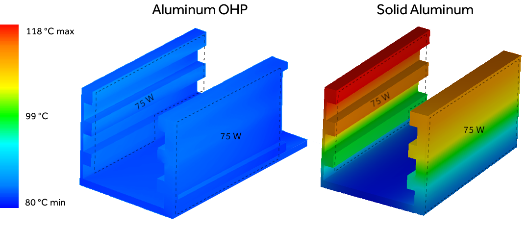 In this on-board vehicular application, the customer had three 3U circuit card assemblies on heat frames, each dissipating approximately 50 W, and the heat frames contacted the OHP-embedded chassis’ vertical rails via wedgelock attachment so that the chassis acquired 150 W of waste heat from the frames and rejected it through the chassis’ horizontal base plate interface.
