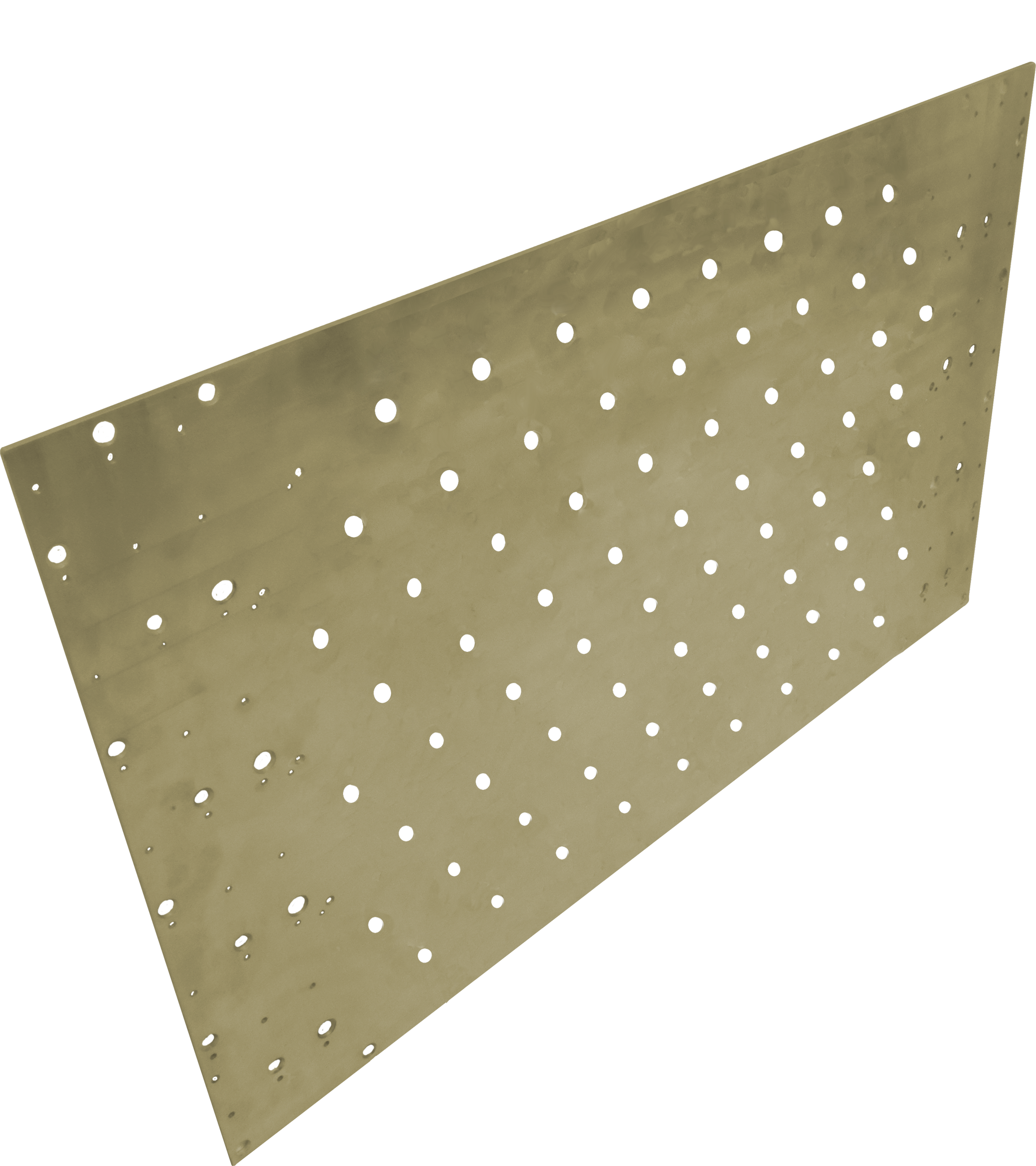 • Al 6061 T4 sized to approx. 19" × 19" × 0.04–0.16" thick, note variable thickness in photo above (available in multiple coatings, platings or films). • Al OHP typ. has 5% less stiffness and 5% higher modal frequencies than solid Al – utilized thicker cross-sections at interfaces with enclosure and larger spacecraft bus structure. |